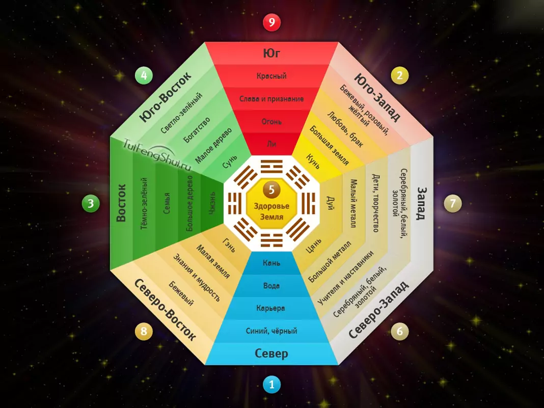 Всяка зона съответства на определена област от живота: благополучие, слава и репутация, взаимоотношения, семейство, здраве, деца и нови идеи, умения и знания, кариера, полезни хора.