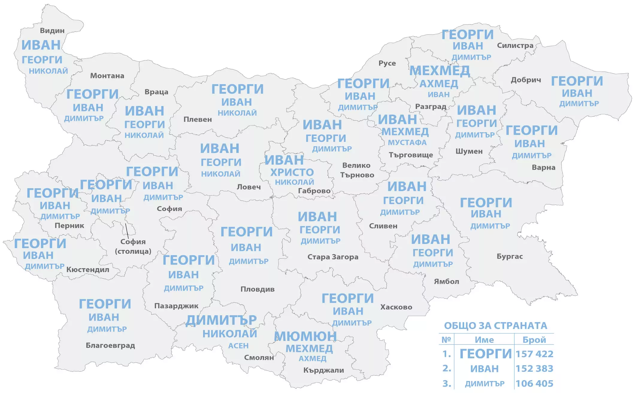 Макар броят им да намалява в сравнение с предходната година, най-разпространени сред мъжете продължават да са имената Георги – 163 хил., Иван – 154 хил., и Димитър – 120 хиляди.