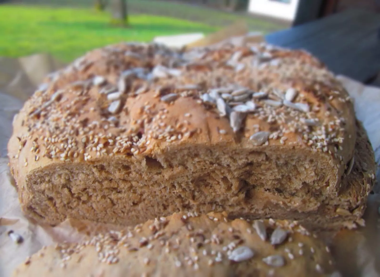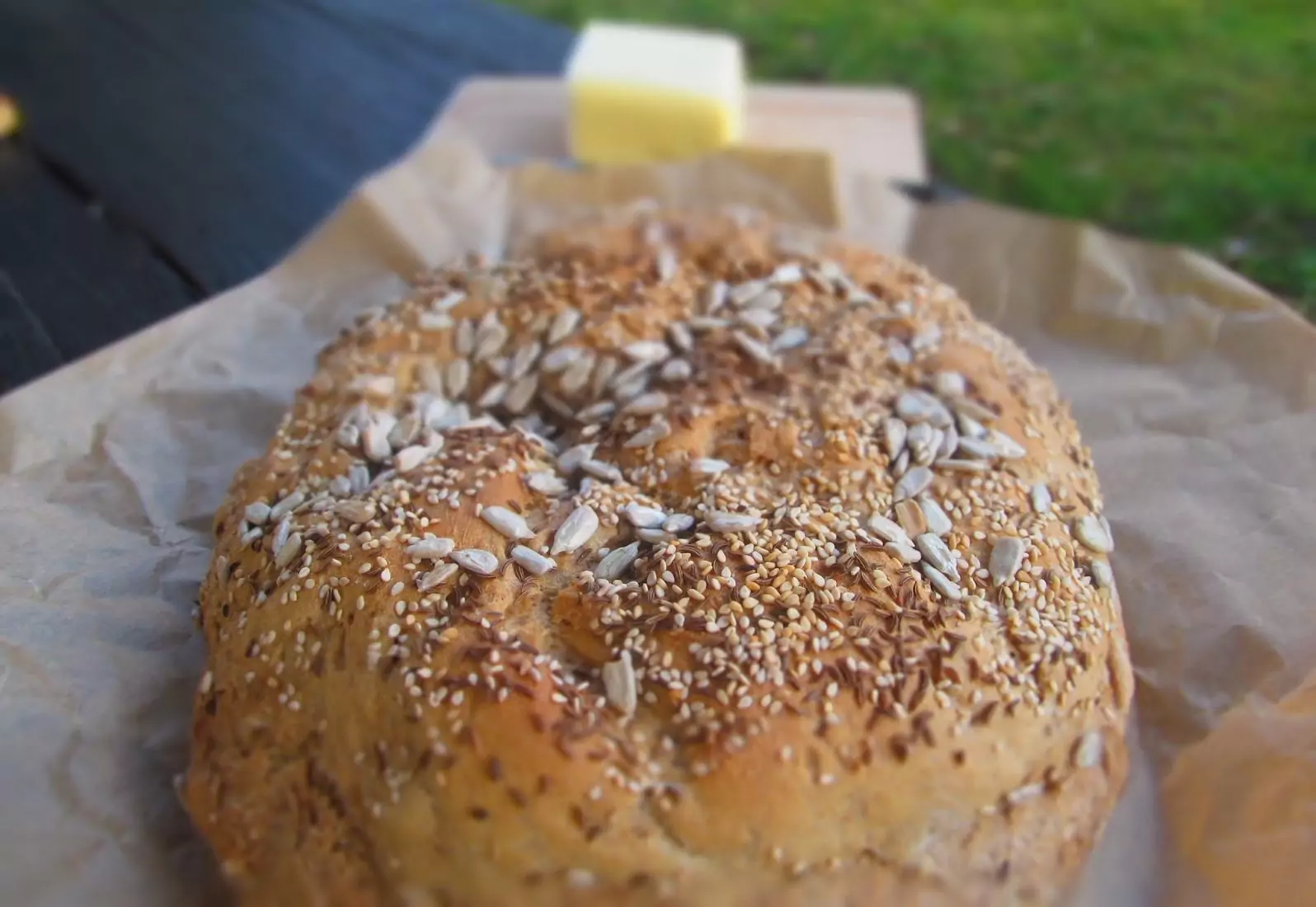 Намажете с оставената бира и поръсете обилно със семената. За да се получи хубава коричка, сложете във фурната под тавата купичка с около 500 мл студена вода. Първите 10 минути печете на 220 градуса, после намалете на 180. Печенето отнема около 35-40минути. Готовия хляб извадете върху решетка да изстине.