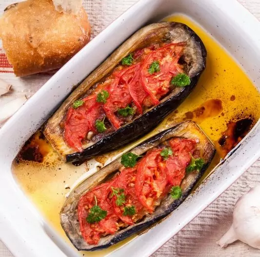 В дълбока тавичка редувайте пласт патладжани и пласт изпържен зелечук. Залейте ястието с 2 ч.ч. вода и 1 ч.ч. олио и го сложете в предварително загрята фурна.