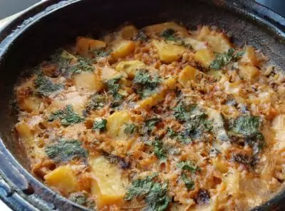 Всичко се изсипва в гърне, разбърква се и се пече. Сервира се топло.
