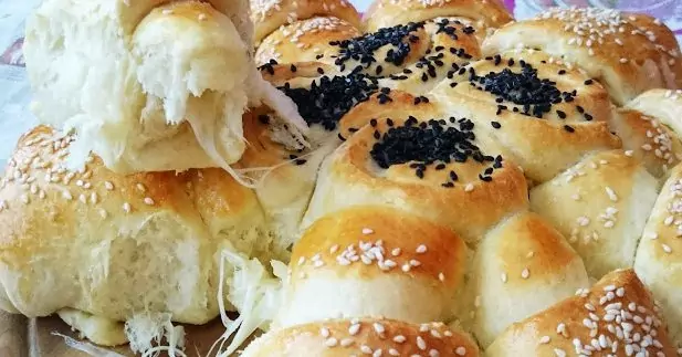 В затопленото мляко около - 36⁰С слагаме маята, захарта, олиото и яйцето. Разбъркваме с сместа и започваме да добавяме от брашното, като замесваме меко и нелепнещо тесто. Оставяме го да почине за 5 минути, като през това време си настъргваме кашкавала на едро.