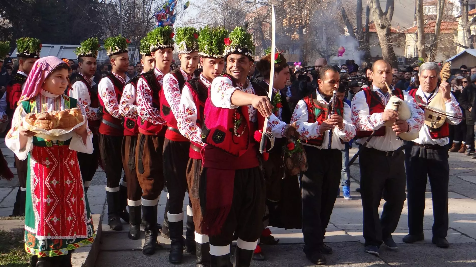 Облечените празнично коледари са с накичени с китки калпаци, а в ръцете си носят „шарени тояги„.