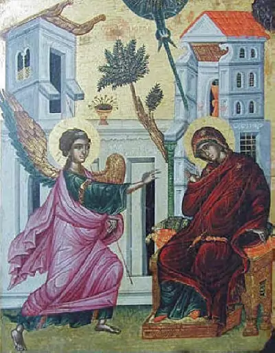 Иконата „Благовещение„ често отразява и стремежа на девицата към свещеното знание. Пред нея има разтворена книга.