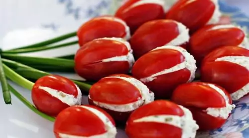 Внимателно отстранете вътрешността със семето и ги напълнете с намачкано и овкусено с подправки по избор сирене. Наредете ги в чинията като букет от лалета или макове , а за стеблата на цветята използвайте пера от пресен лук, Поръсете със сол и зехтин готовия букет и очаквайте овации.