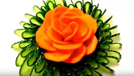 Добре ще е да комбинирате цветето от прясна краставица с розички от морков и ряпа. Техниката е същата, но тънкостта за изработването им е финалното стабилизиране на готовото цвете с 1 или 2 клечки за зъби, набучени на кръст в основата на цветето, както и изрязването на твърде дългите долни краища на зеленчуковите резени.