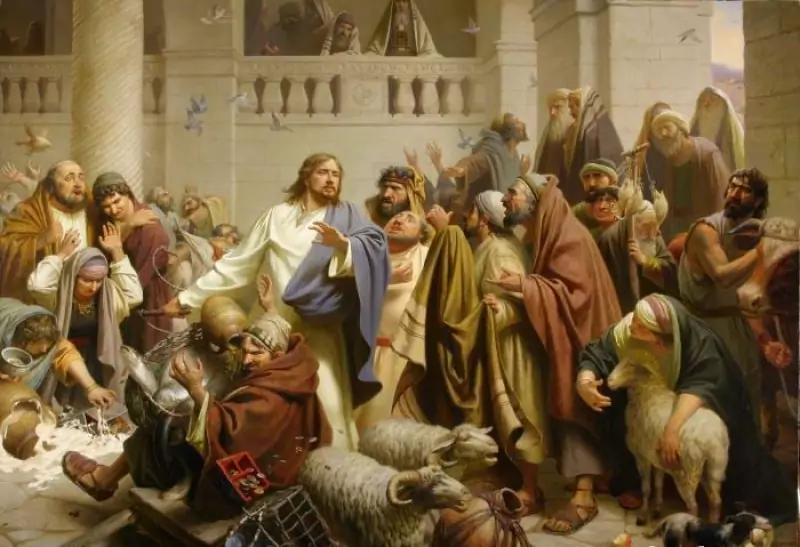 Според библейския разказ, на този ден Исус отишъл на поклонение в Йерусалимския храм – светинята на всички евреи. На площада и в предверието на храма заварил сергии и голяма глъч, караници и врява. За да влязат в храма, всички евреи трябвало да си платят, и то не със свои, а с храмови пари.