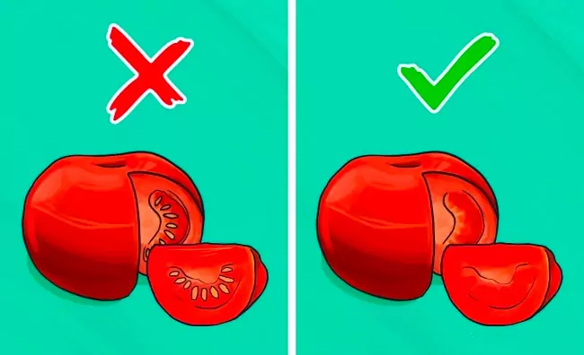 -Ако искате да изрежете домат, без да изтече сока му, отрежете стриктно по сърцевината на повърхността на домата: във вътрешността има вътрешни жили, които разделят семената от стената на доматите.