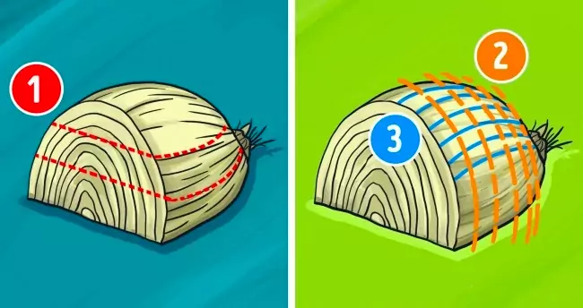 –Нарязването на лука може да бъде лесно, ако първо го разделите на две, отрежете върха и корена, направите някои хоризонтални разреза и ги следвате. Количеството разрези зависи от желания размер на кубчетата. И накрая, нарязвате лука напречно.