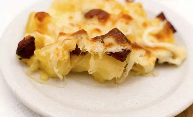 Докато се варят картофите, нарежете бекона на лентички или парченца. Загрейте слънчогледовото олио и запържете нарязания бекон до златисто. Разпределете хрупкавите парченца бекон върху картофите, а мазнината излейте върху тях.