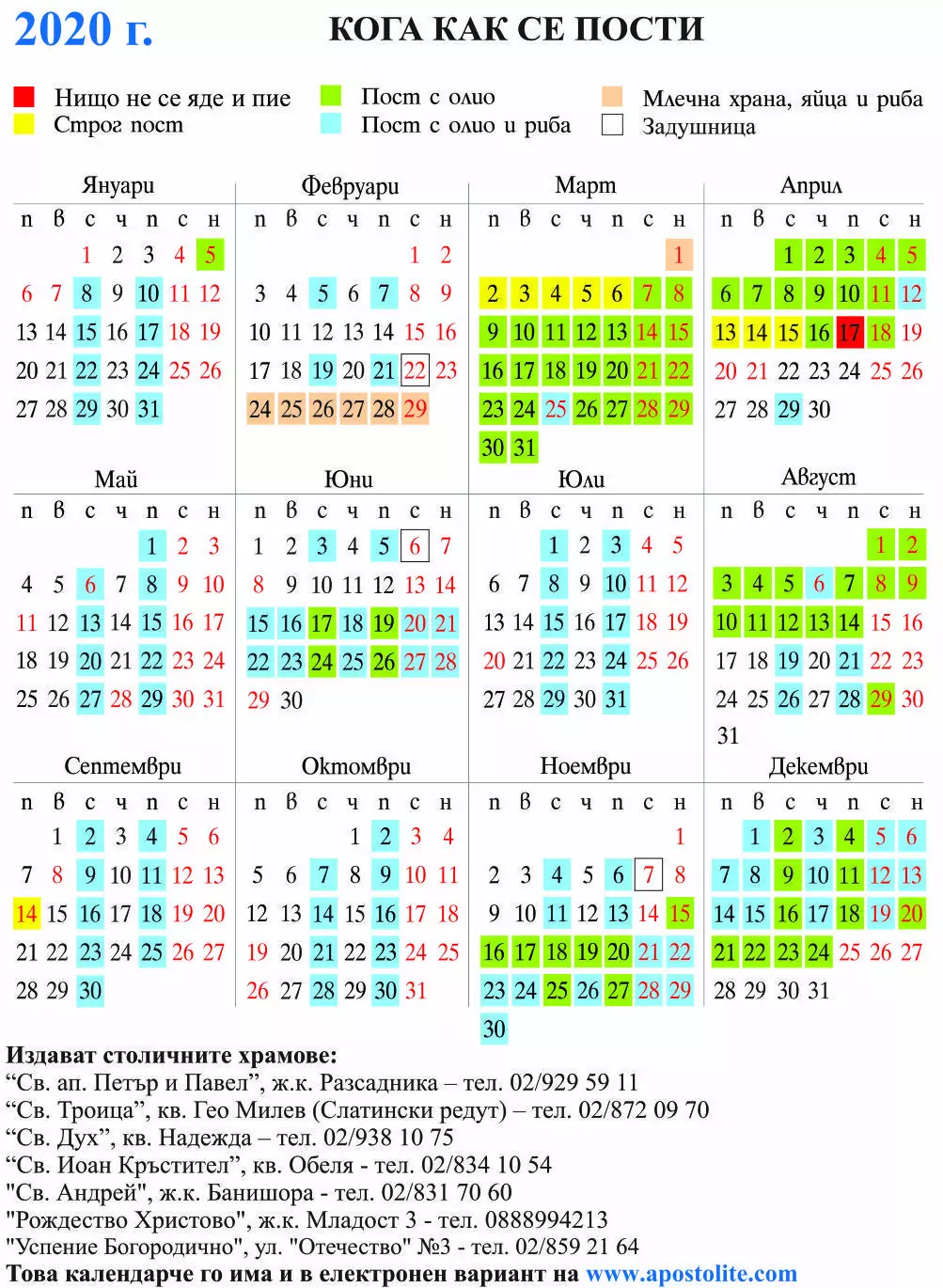Предлагаме ви календар с дните за пости от сайта Апостолите