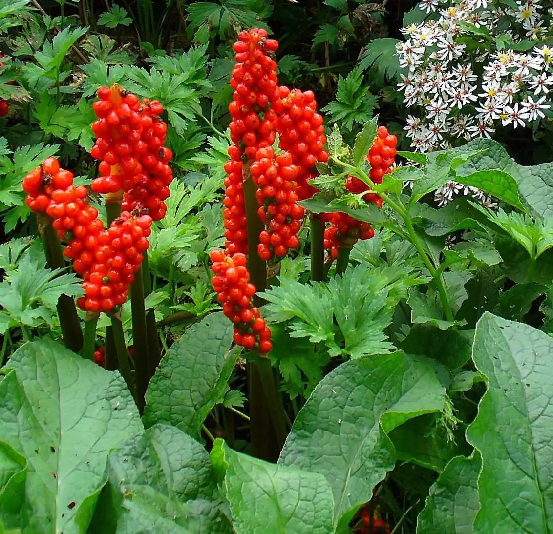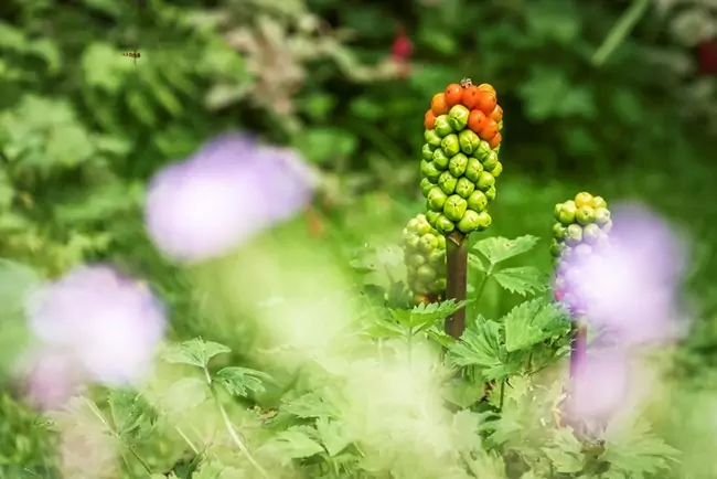 Листата на билката най-често са с кафяви петна и обгръщат цветоносния стълб. Преди да узрее плодът прилича на царевичен кулен. След като узрее цветът му става червен.