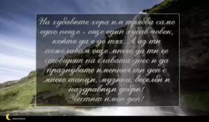 На хубавите хора им трябва само едно нещо – още един хубав човек, който да е до тях. А аз ти пожелавам още много да ти се стоварят на главата днес и да празнувате именния ти ден с много танци, музика, веселби и наздравици добри!