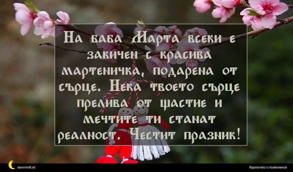 На баба Марта всеки е закичен с красива мартеничка, подарена от сърце. Нека твоето сърце прелива от щастие и мечтите ти станат реалност. Честит празник!