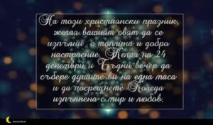 На този християнски празник, желая вашият свят да се изпълни с топлина и добро настроение. Желая на 24 декември и Бъдни вечер да събере душите ви на една маса и да посрещнете Коледа изпълнена с мир и любов.