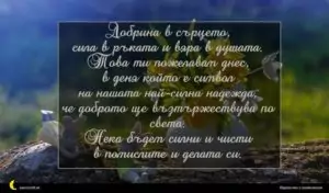 април 1, 2020 Великден Пожелание за Великден 66 за 17 февруари 2026 Добрина в сърцето, сила в ръката и вяра в душата. Това ти пожелавам днес, в деня който е символ на нашата най-силна надежда, че доброто ще възтържествува по света. Нека бъдем силни и чисти в помислите и делата си.