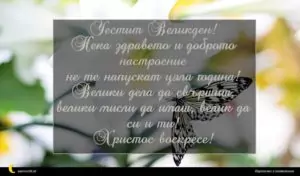 април 1, 2020 Великден Пожелание за Великден 8 за 17 февруари 2026 Честит Великден! Нека здравето и доброто настроение не те напускат цяла година! Велики дела да свършиш, велики мисли да имаш, велик да си и ти! Христос воскресе!