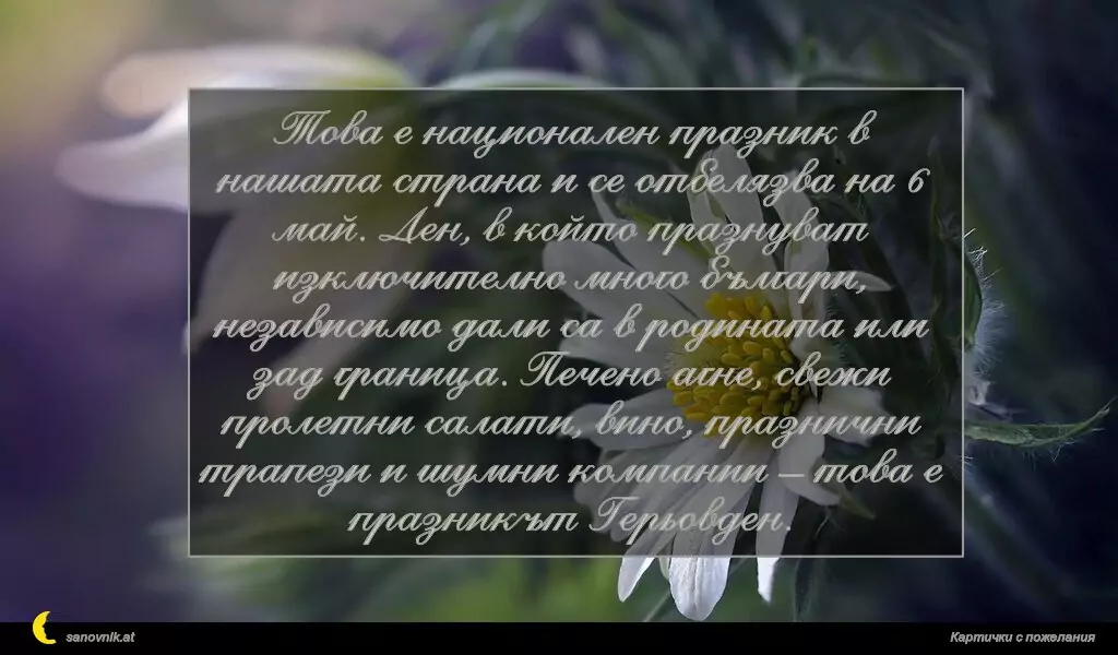 Това е национален празник в нашата страна и се отбелязва на 6 май. Ден, в който празнуват изключително много българи, независимо дали са в родината или зад граница. Печено агне, свежи пролетни салати, вино, празнични трапези и шумни компании – това е празникът Герьовден.