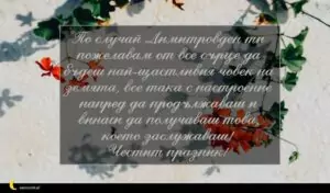 По случай Димитровден ти пожелавам от все сърце да бъдеш най-щастливия човек на земята, все така с настроение напред да продължаваш и винаги да получаваш това, което заслужаваш!
