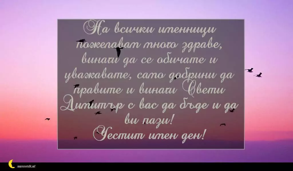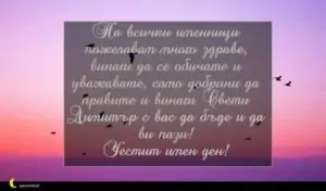 На всички именници пожелавам много здраве, винаги да се обичате и уважавате, само добрини да правите и винаги Свети Димитър с вас да бъде и да ви пази!