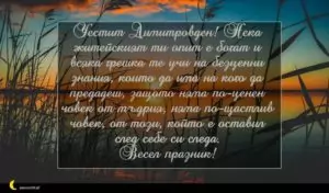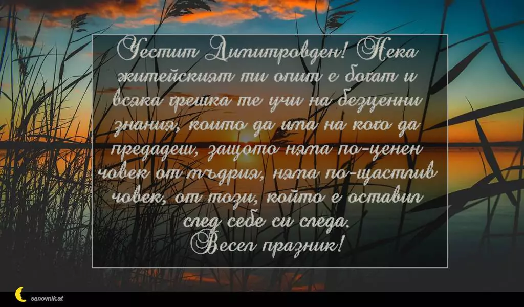 Честит Димитровден! Нека житейският ти опит е богат и всяка грешка те учи на безценни знания, които да има на кого да предадеш, защото няма по-ценен човек от мъдрия, няма по-щастлив човек, от този, който е оставил след себе си следа.