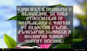 януари 1, 2021 Ивановден Пожелание за Ивановден 13 Един път в годината е Ивановден, за това отпразнувай го подобаващо с фонтан от радостни сълзи, лъчезарни усмивки и неспирни танци. Честит празник!