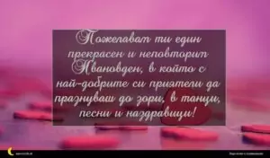 януари 1, 2021 Ивановден Пожелание за Ивановден 31 Пожелавам ти един прекрасен и неповторим Ивановден, в който с най-добрите си приятели да празнуваш до зори, в танци, песни и наздравици!