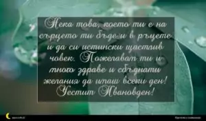 януари 1, 2021 Ивановден Пожелание за Ивановден 40 Нека това, което ти е на сърцето ти бъде и в ръцете и да си истински щастлив човек. Пожелавам ти и много здраве и сбъднати желания да имаш всеки ден! Честит Ивановден!