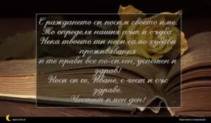 януари 1, 2021 Ивановден Пожелание за Ивановден 47 С раждането си носим своето име. То определя нашия път и съдба. Нека твоето ти носи само хубави преживявания и те прави все по-силен, успешен и здрав! Носи си го, Иване, с чест и със здраве. Честит имен ден!