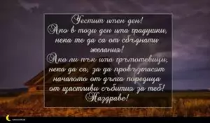 юли 5, 2020 Илинден Пожелание за Илинден 1 за 15 февруари 2026 Честит имен ден! Ако в този ден има градушки, нека те да са от сбъднати желания! Ако ли пък има гръмотевици, нека да са, за да провъзгласят началото от дълга поредица от щастливи събития за теб! Наздраве!