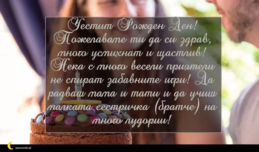 Честит Рожден Ден! Пожелаваме ти да си здрав, много усмихнат и щастлив! Нека с много весели приятели не спират забавните игри! Да радваш мама и тати и да учиш малката сестричка (братче) на много лудории!