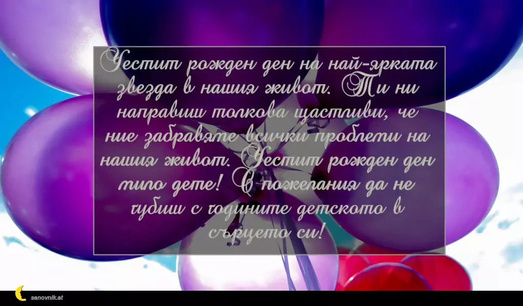 Честит рожден ден на най-ярката звезда в нашия живот. Ти ни направиш толкова щастливи, че ние забравяме всички проблеми на нашия живот. Честит рожден ден мило дете! С пожелания да не губиш с годините детското в сърцето си!