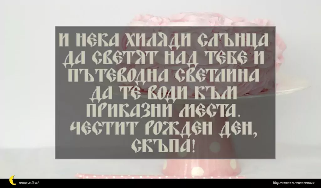 април 4, 2020 Рожден ден на жена Пожелание за Рожден ден на жена 7 за 11 февруари 2026 И нека хиляди слънца да светят над тебе и пътеводна светлина да те води към приказни места. Честит рожден ден, скъпа!