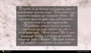 Бъдете си за всичко необходими, дори в житейските прости неща. Само така през годините трудни ще покорите света. Не искайте един от друг неща невъзможни, достатъчна е и една дума добра. Изживейте заедно всички минути тревожни до мига, когато ще сте с посребрена коса. Нека очите Ви в една посока да гледат, а ръцете да милват послушни деца. Нозете Ви една пътека да следват – пътеката на радостта!