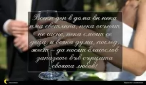март 9, 2020 Сватба Пожелание за Сватба 40 за 11 февруари 2026 Всеки ден в дома ви нека има светлина, нека огънят не гасне, нека смеят се деца, и всяка дума, поглед, жест – да носят благослов запазете във сърцата своята любов!