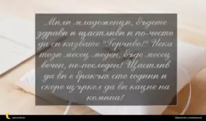 март 9, 2020 Сватба Пожелание за Сватба 53 за 11 февруари 2026 Мили младоженци, бъдете здрави и щастливи и по-често да си казвате „Горчиво!“ Нека този месец меден, бъде месeц вечен, не-последен! Щастлив да ви е бракът сто години и скоро щъркел да ви кацне на комина!
