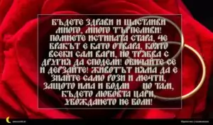 Бъдете здрави и щастливи много, много търпеливи! Помнете истината стара, че бракът е като отвара, която всеки сам вари, но трябва с другия да сподели! Обичайте се и дерзайте! Животът няма да е знайте само рози и мечти, защото има и бодли … Но там, където любовта цари, убождането не боли!