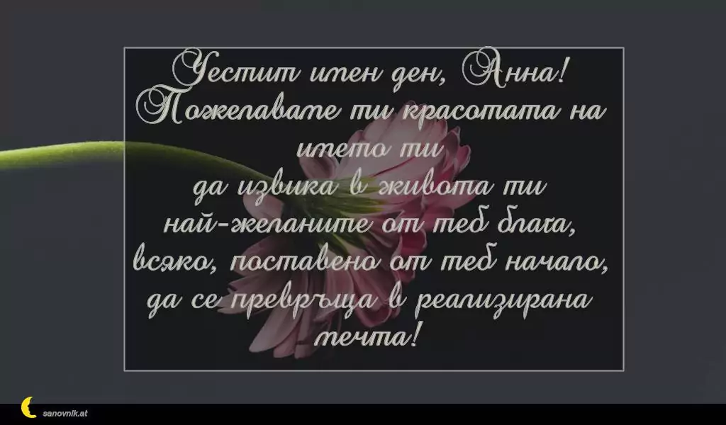 юли 22, 2020 Св. Анна Пожелание за Св. Анна 4 за 12 февруари 2026 Честит имен ден, Анна! Пожелаваме ти красотата на името ти да извика в живота ти най-желаните от теб блага, всяко, поставено от теб начало, да се превръща в реализирана мечта!