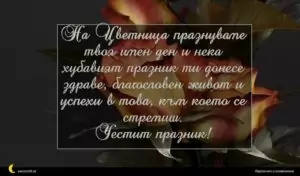 март 8, 2020 Цветница Пожелание за Цветница 10 за 12 февруари 2026 На Цветница празнуваме твоя имен ден и нека хубавият празник ти донесе здраве, благословен живот и успехи в това, към което се стремиш. Честит празник!