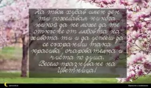 март 8, 2020 Цветница Пожелание за Цветница 6 за 12 февруари 2026 На твоя хубав имен ден ти пожелавам никога никой да не може да те откъсне от любовта на живота ти и да успееш да се съхраниш така красива, очарователна и чиста по душа. Весело празнуване на Цветница!