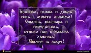 март 2, 2020 8 март Пожелание за 8 март 2 за 12 февруари 2026 Красива, нежна и добра, това е моята любима! Сияеща, искряща и неотразима, отново пак е моята любима! Честит 8 март!