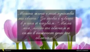 март 2, 2020 8 март Пожелание за 8 март 38 за 12 февруари 2026 Моята жена е най-красива на света! За това с цвете в ръка й казвам: “Мила моя, много те обичам и само в нежност днес те обличам”!