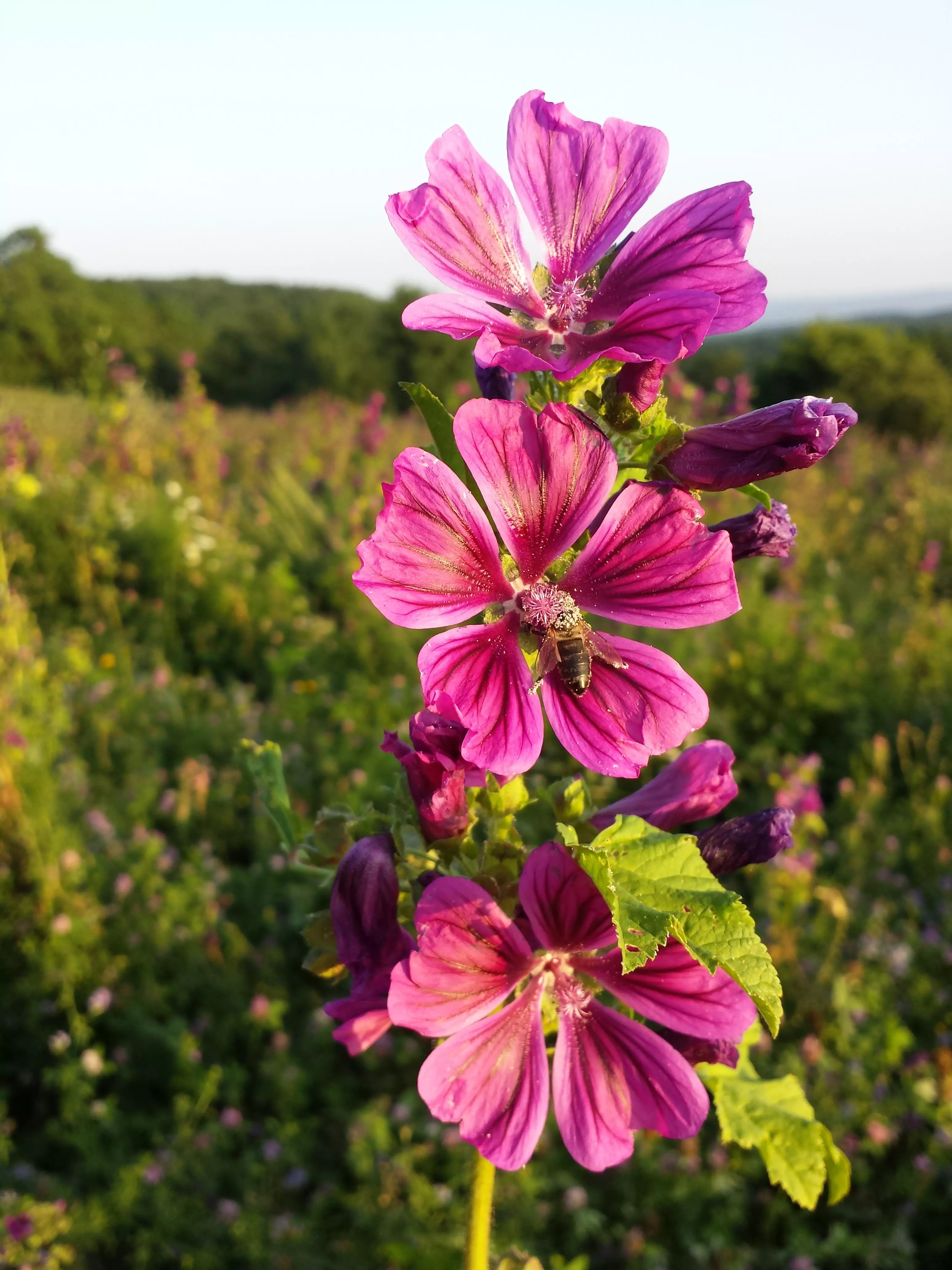 Цветовете са по няколко в пазвите на листата, едри, 3-4 cm в диаметър; чашката им е двойна – същинската (вътрешната) с 5 листчета, дълги 5-6 mm, сраснали над средата си и външна по-къса с 3 свободни листчета. Венчелистчетата на цветовете 5 свободни, на върха си са дълбоко врязани, дълги 12-30 mm, бледолилави, с по-тъмни надлъжни жилки.