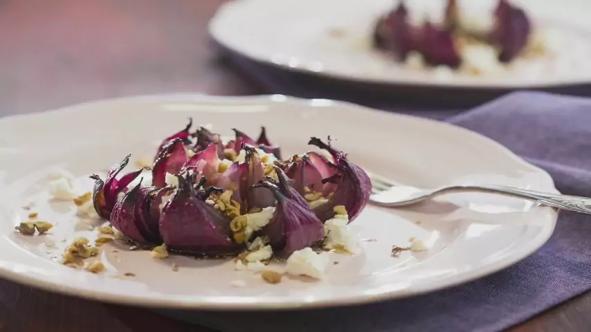 - След това фолиото се отстранява и лукът се допича за още 10 мин. Поднася се с накълцани орехи и натрошено сирене.